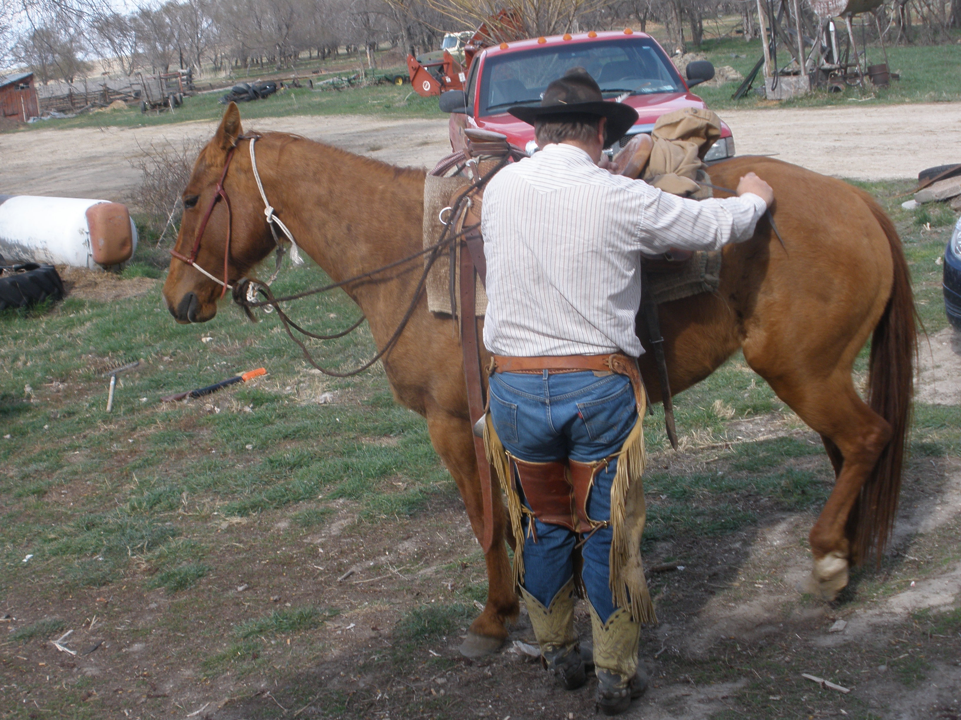 Previous Image Next Image P4190027 Just tied my coat on the back and about to step on Peaches, the 9 year old “colt”