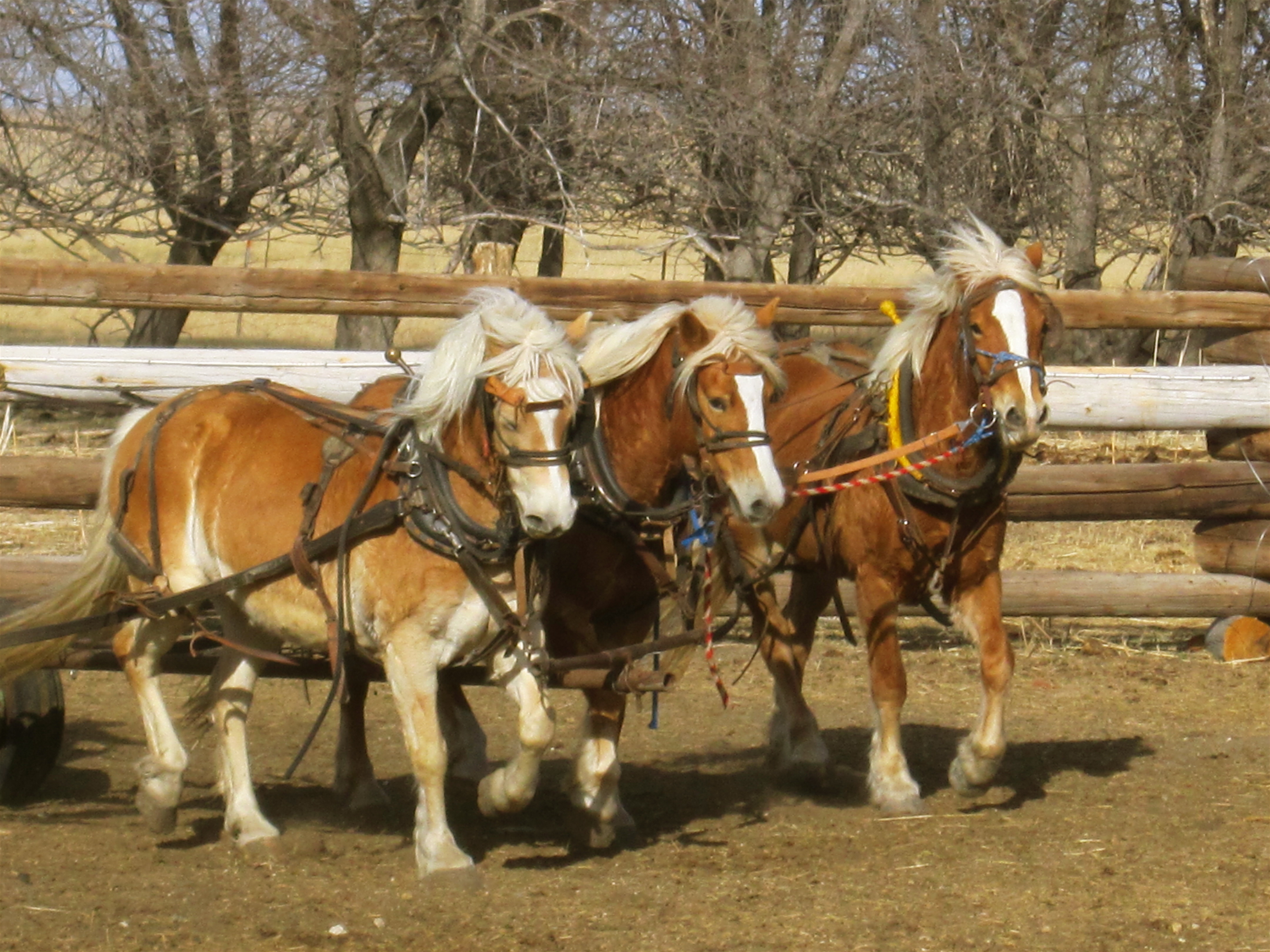 I went up to Chance and Hopes this morning and Chance said he’d help me drive Wren, hooked to Ron and Roz. Marshal was there so he came along to. We got them all caught and hooked up, 3 abreast.. drove out and hooked just Ron and Wren to the wagon, with Wren tied back to Ron and Roz. Roz was just along for the drive and kind of an anchor on Wren on the outside… Didn’t go to bad until we tried to back up to a bale and Ron couldn’t pull both Wren and Roz around, to get lined up to a bale. So Chance watched them and I got Roz unhooked, Marshal took her and we commenced to backing up and getting a bale with just Wren and Ron hooked up. Chance got the gate and waited while I went and fed that bale… got that done and when headed back Wren would grab herself and take off and we had a mild kind of runaway for awhile. I just pulled Ron to the inside of the circle and after a bit she slowed up enough so I could get them stopped… I realized I did not have her tied back short enough to Ron’s hame.. so I’d go and stop, go and stop.. finally got back to the gate where Chance and Marshal were waiting, Chance shortened up the halter rope and they got on and away we went.. Chance would trade off on the lines with me as they were really pulling on your hands, hard.. by golly by the time we got the 6th bale fed, things were going good. I left them harnessed and am going out after bit and haul out some more hay for them for tomorrow, as we are going to work them all. I bet Wren will sleep real good tonight! I know I am tuckered out and my hands are sore, but it was a good deal for the team and probably for my fat old body! 😀