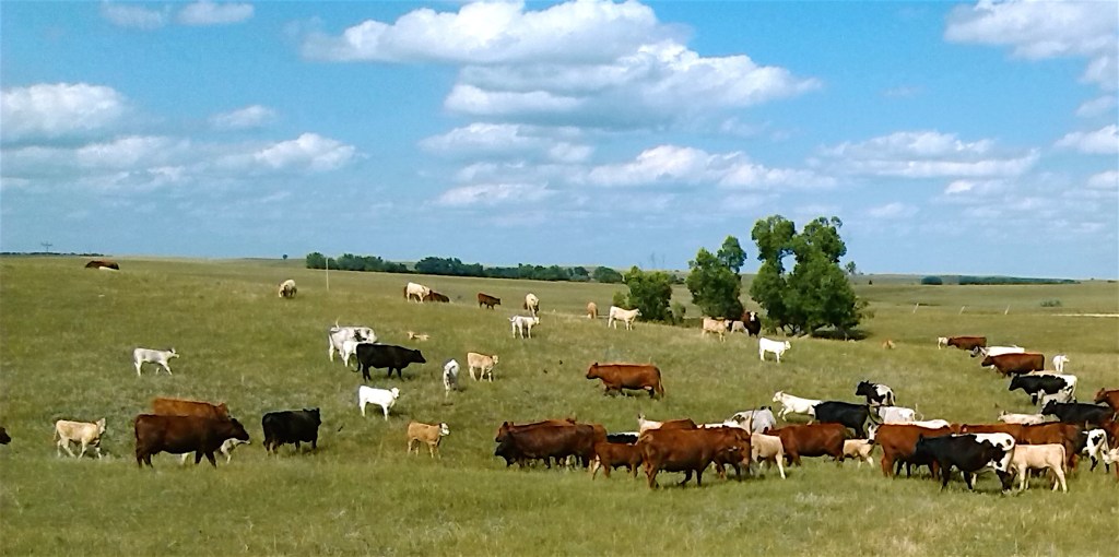 In all the time my family has spent on this land, we have practiced conservation. Ideas have changed over the years and what were at one time thought of as good practices have been found to be lacking perhaps, and new and improved ways of doing things have made a lot of changes. At one time, plowing the ground and farming it so as to plant different crops or grasses was thought to be the best idea. Now, most who do any farming , do so with the use of chemicals, to get rid of weeds and prepare the ground for a new planting. The “dust bowl” years of the 30’s changed a lot of minds, but it still took many years for people to change the way they farmed. The same with grazing livestock. As a child, my father had certain times of the year when we moved the cattle to different pastures. A certain number of cattle were put into a pasture in spring and that is where they stayed until fall or early winter. Now, we understand that it is better for the cattle to graze a small area and move on. Similar to what people do who have nice green lawns. By putting larger numbers on smaller areas, the cattle have to pretty much eat what is in front of them or some other cow will.. it is called competition. So they learn to not be so discriminating in their tastes. We went thru’ a time not so long ago where we went into our pastures and cross fenced them, making more, smaller pastures. We ran yearlings at the time and we would move them ever 5 to 7 days more or less. We found by doing this, the cattle hoof action on the ground loosened the soil a bit, helping to plant new seeds and of course the cows ate grasses, forbs and plants that before, they would not have. They also concentrated their manure and urge, so were fertilizing the ground better. This gave all the plant an even start and they were o equal footing, so to speak, in the amount of rainfall and sunlight they recieved. So the faster growing species of grass, could out compete the woody plants and “weeds”. And by doing this we found we could run more cattle than we had before. We also, for several reasons, quit putting up hay annually, as we had for years. The land that was seldom grazed and dedicated for hay, was the lower, more productive ground, that would raise more pounds of feed to the acre. So by eliminating haying on this ranch, we could run about a third more cows. On years where we have more rainfall, and extra feed, we do still have some hay put up at times. But we hire someone with the machinery to come in and do it, for a payment or for part of the hay, they put up. We have found, year in and year out, what with the cost of the machinery needed, we can buy what hay we need, for the same or less cost than what it would cost if we did it ourselves. At some point in the future, that may not be true and at that time we will make a correction. But for now, what seems to make this land thrive, is to use cattle to mow off the grasses and plants and move them on to fresh grazing. In the last few years it has come to my attention, that be training our cattle to stay in a tighter grouped herd, they can do so with out having to use the constraints of fences. Which is great, as fences cost a lot of money to build and maintain. It does take a bit more time, as you need to be out and around the cattle every day, but then, I enjoy saddling a horse and riding around and through the cattle. And it seems like others do also.
